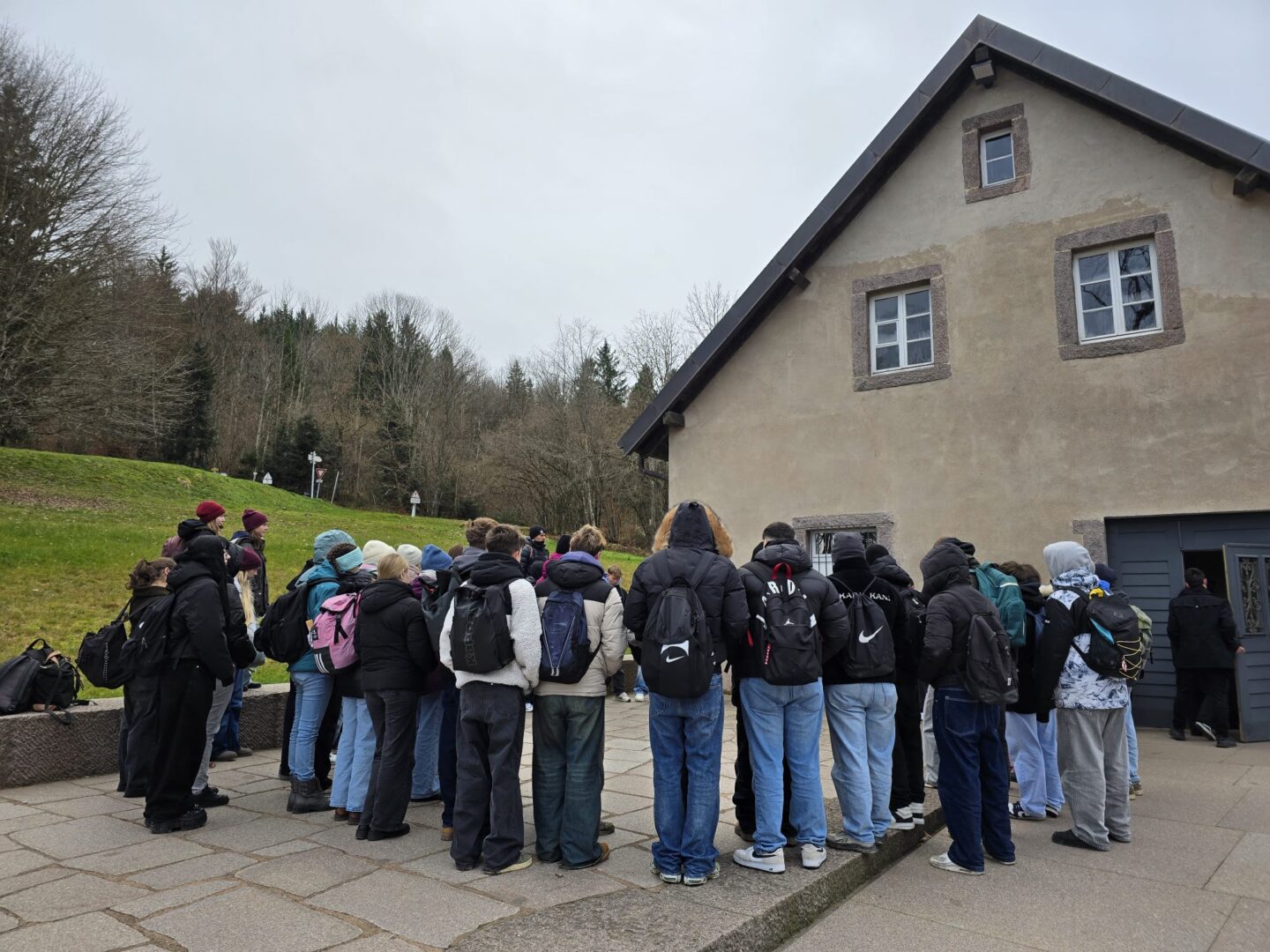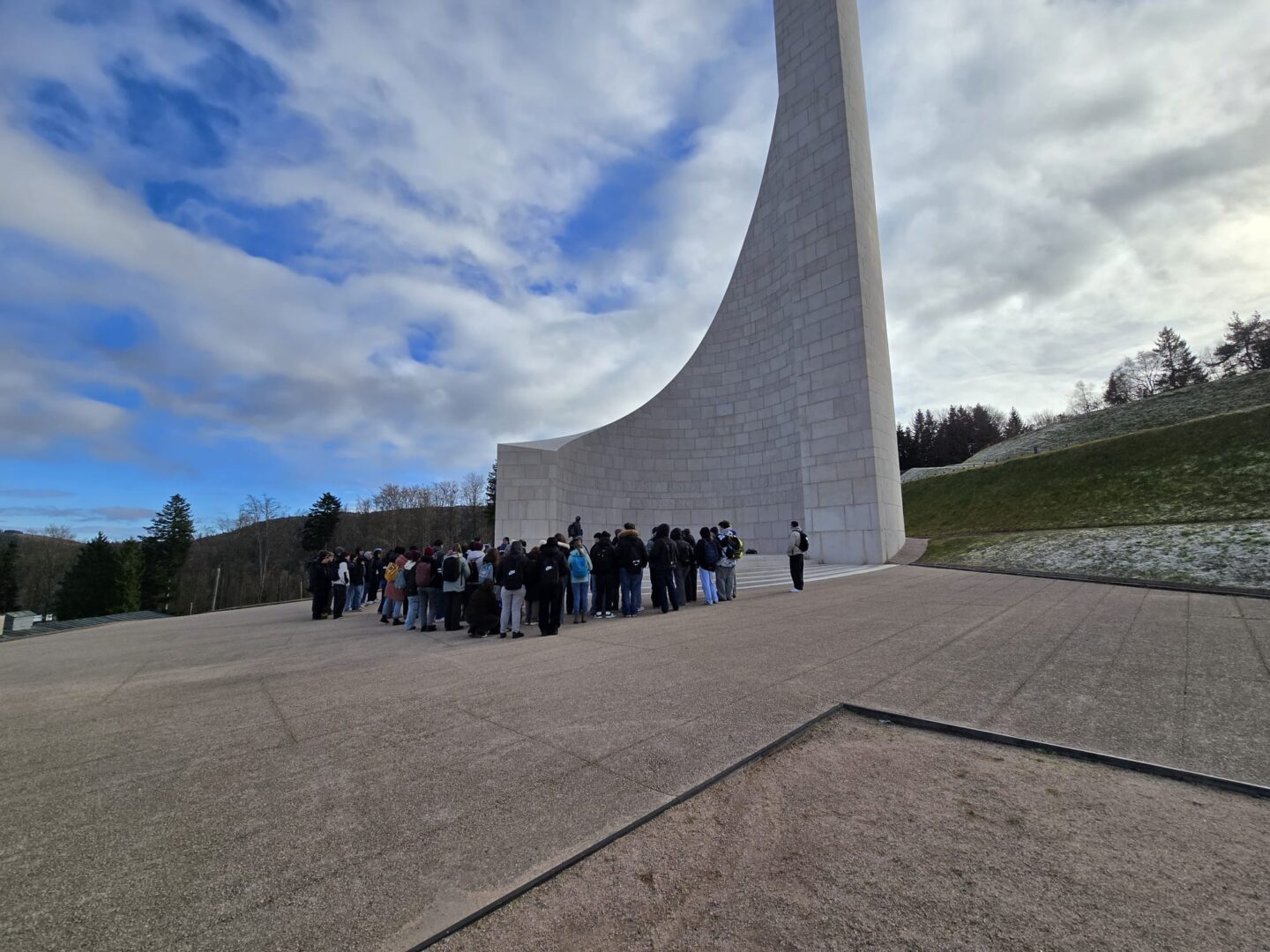 Gut vorbereitet trafen wir bei kaltem, aber schönem Wetter, in dem auf 700 m ü. M. liegenden KZ ein. Vor Ort wurden die Jugendlichen in Gruppen durch das Lager geführt. Vom Mahnmal mit dem angrenzenden Friedhof ging es durch die Eingangspforte in das doppelt mit Stacheldraht umzäunte Areal. Die SchülerInnen staunten nicht schlecht, als sie vor dem Küchenblock hörten, mit wie wenig Nahrung die Häftlinge die harte Arbeit durchstehen mussten. So wogen viele Häftlinge nach ein paar Monaten nur noch 30- 40kg! Am meisten Eindruck hinterliessen aber die zwei Gebäude ganz zuunterst im KZ. Im Gefängnisblock wurden die Häftlinge in enge Zellen gesperrt, wo sie weder stehen noch sitzen konnten. Und im benachbarten Gebäude, dem Krematorium, befand sich neben dem Verbrennungsofen, welcher zugleich auch das Wasser für neu ankommende Häftlinge aufwärmte, auch noch ein Seziertisch für die bestialischen medizinischen Experimente an den Häftlingen.