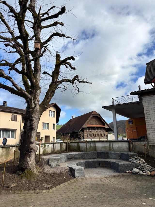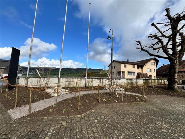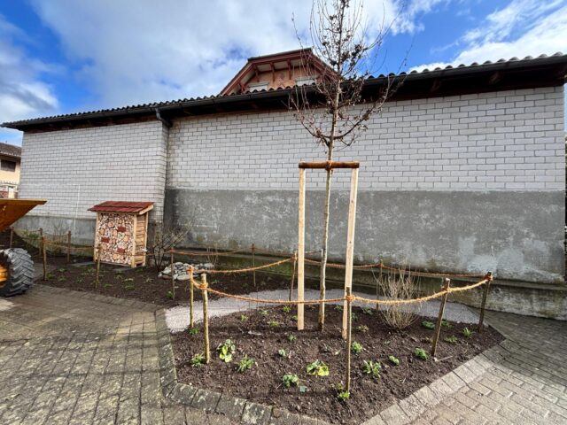In die Planung und Umsetzung flossen auch die Ideen und Wünsche der Schülerinnen und Schüler sowie der Lehrpersonen der Basisstufe mit ein. Ziel war es, eine vielfältige und naturnahe Bepflanzung mit einheimischen Pflanzen und Sträuchern zu schaffen, sodass wieder vermehrt Lebensraum für Insekten und Kleintiere entsteht. Selbstverständlich durfte ein neues Vogelhaus und ein grosses Bienenhotel nicht fehlen.
